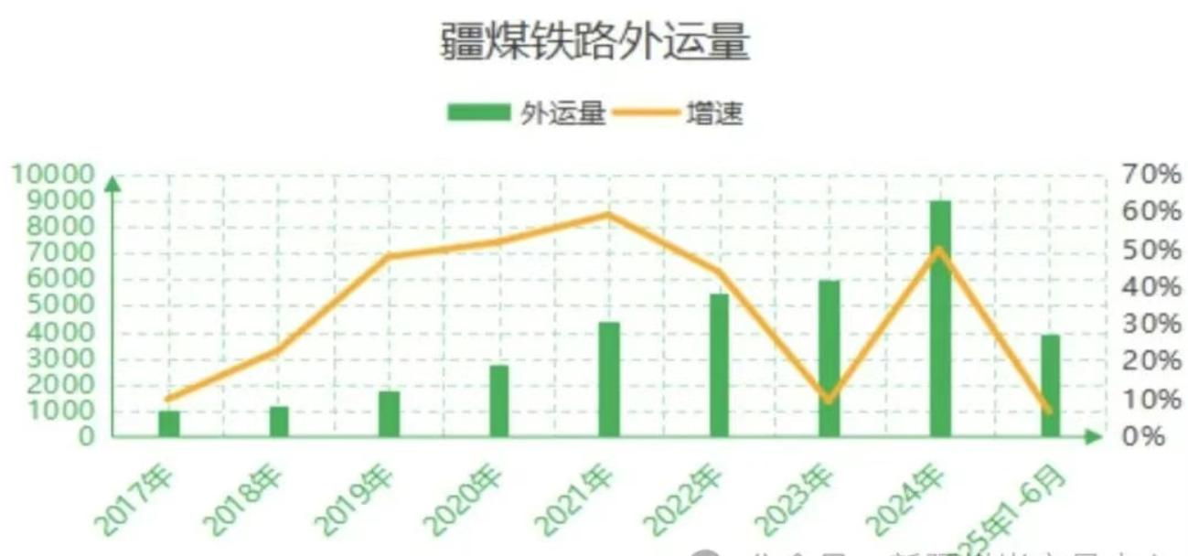 疆煤外运方面:1-5月疆煤外运总量约5700万吨,较去年同期增速显著放缓,其中:通过铁路外运3798万吨,同比增长6.8%,预计1-6月疆煤外运总量约6800万吨。疆煤外运增长态势显著放缓主要受三重因素制约:一是需求疲软压制利润空间:2025年煤炭需求不足态势延续,导致港口5500大卡动力煤价同比下跌超30%,削弱了新疆煤炭外销利润;二是高基数效应放大增速压力:2024年通过铁路运输疆煤外运量同比激增50.2%,创历史新高,使得2025年增速在基数效应下承压;三是运费政策对冲效果有限,尽管新疆铁路部门自3月起实施运费下浮政策,降低企业综合成本,但需求端疲软仍制约了政策效果的充分释放。