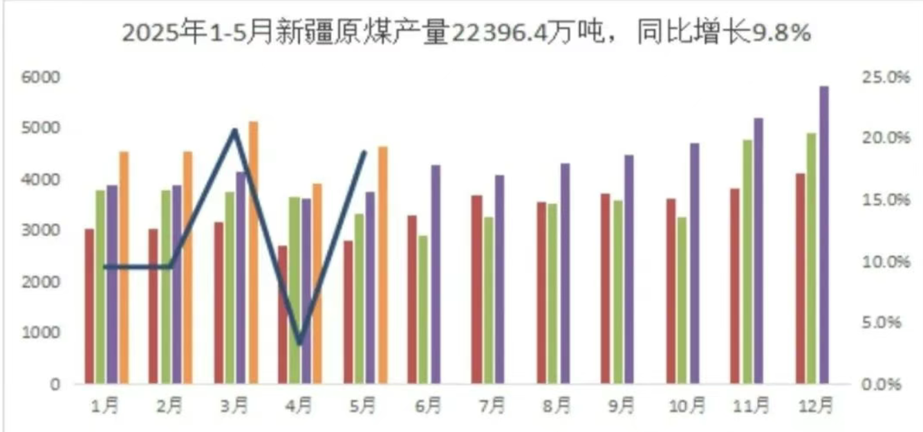 供应端:2025年,在煤炭市场持续低迷的背景下,新疆原煤产量仍保持强劲增长态势。从长期趋势来看,新疆已成为全国煤炭主产区中增长最为显著的地区。数据显示,2021-2024年期间,新疆原煤产量从3.21亿吨跃升至5.41亿吨,年均复合增长率达13.9%,累计增量达2.2亿吨。特别是在2022年突破4亿吨产能后,仅用两年时间就实现了5亿吨的产能跨越,展现出强劲的产能扩张势头。从2025年1-5月的生产数据来看,在全国四大煤炭主产区中,新疆以9.8%的同比增速领跑,显著高于内蒙古(0.9%)、陕西(3.1%),仅次于山西(13.6%)。