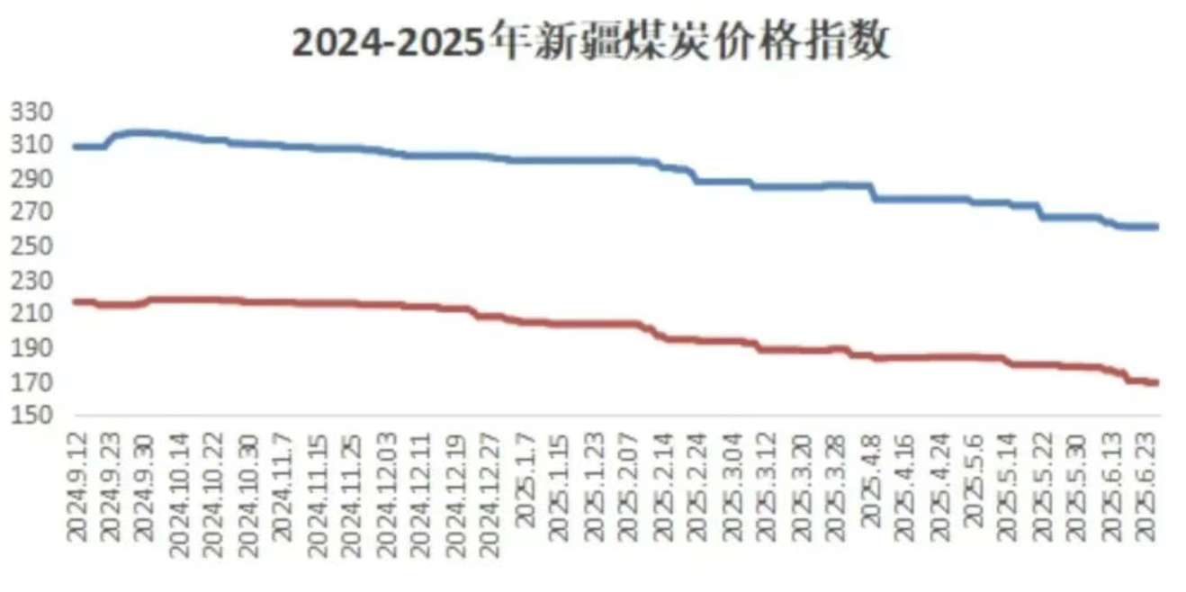 CCI新疆5500和CCI新疆5000价格指数在2025年上半年均呈现持续下跌趋势,且跌幅显著,新疆5500累计下跌13.1%,新疆5000累计下跌18.1% ,5000卡煤种跌幅大于5500卡,反映低热值煤需求更疲软。
