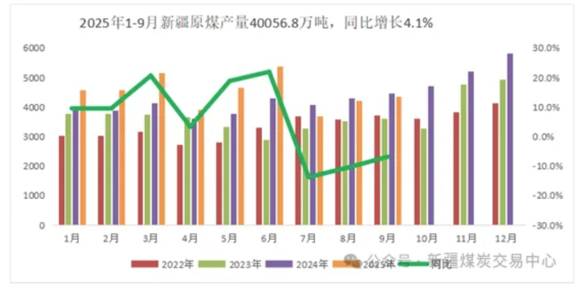 1-9月,新疆原煤产量40056.8万吨,同比增长4.1%。