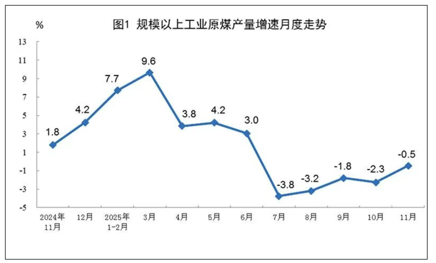 2025年,国内煤炭产量保持温和增长态势。国家统计局12月15日数据显示,1-11月份,规上工业原煤产量44亿吨,同比增长1.4%。今年前六个月与2024年同期相比均呈增长态势,但受“反内卷”政策等因素影响,7-11月产量分别同比下降3.8%、3.2%、1.8%、2.3%和0.5%。预计2026年国内煤炭产量将保持稳定增长,但增速将进一步放缓。