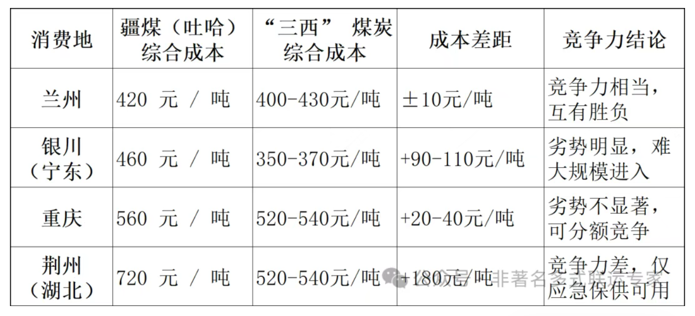 关键结论:疆煤仅在西北优势圈能与 “三西” 煤炭正面抗衡,川渝地区需依托需求缺口弥补成本劣势,宁东、华中地区难成主力市场。