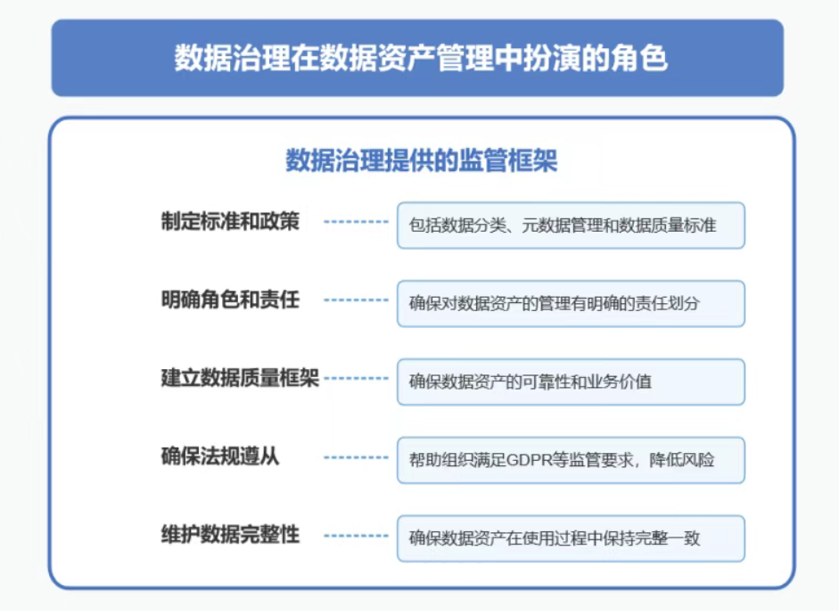 具体而言,数据治理为数据资产管理提供了监管框架,包括:
