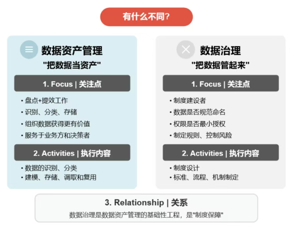 如果把数据比作商品,资产管理管的是“货架怎么摆、客户怎么用”,治理则管的是“商品合格没、使用合不合法”。