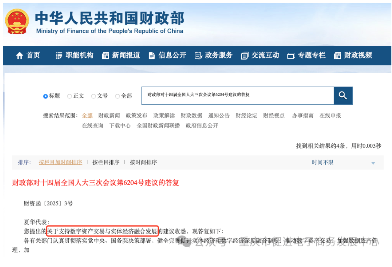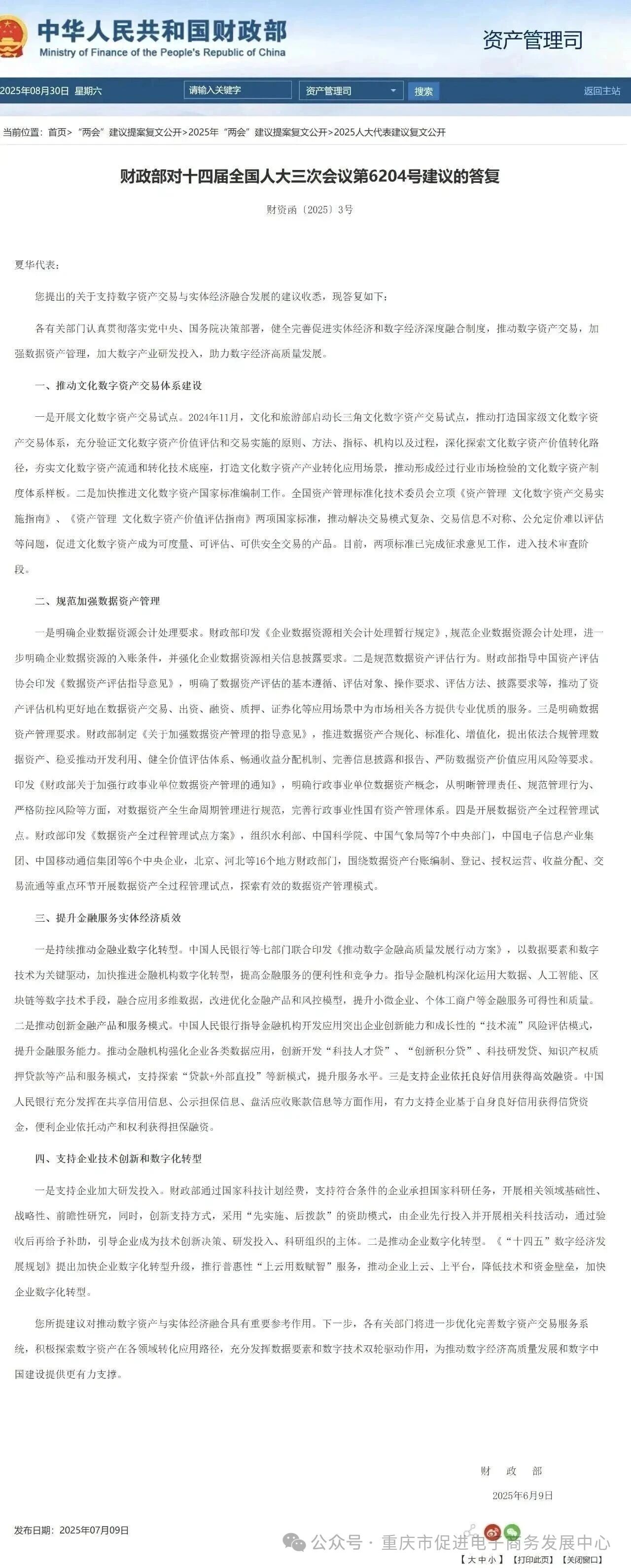 在数字技术深度重构产业生态的进程中,"数字资产" 正由技术范式升维为经济要素,成为贯通数字空间与物理世界的价值桥梁。财政部对十四届全国人大三次会议第 6204 号建议的复函(财资函〔2025〕3 号),首次完整构建了促进数字资产交易与实体经济协同发展的制度体系,预示着我国数字经济治理进入"规制与发展协同"的深化期。本文立足政策文本、智库观点与商业案例,解构二者融合的价值逻辑与演进路径。