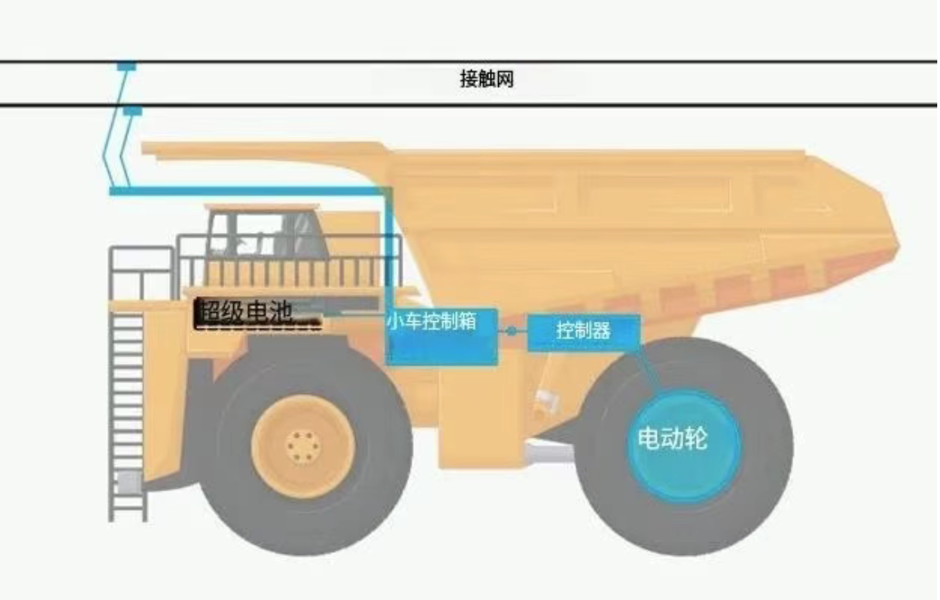 一些矿山采用电车助力系统,即自卸卡车使用架空接触线作为电源。其优点包括降低燃料成本和二氧化碳排放,因为卡车不完全依赖柴油发动机,但架空接触线也限制了行动自由,并对矿山的物流和路线规划产生影响。